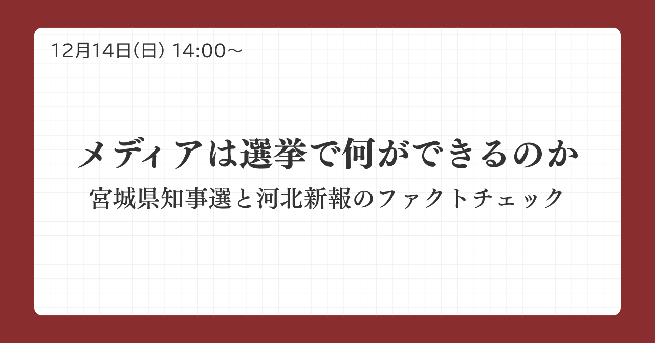 認定NPO法人ファクトチェック・イニシアティブ(FIJ)は、スローニュース社と共催で、2025年12月14日(日)にセミナー「メディアは選挙で何ができるのか ― 宮城県知事選と河北新報のファクトチェック」を開催します。